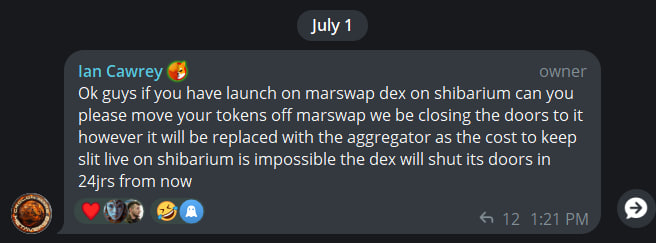 On July 1st it was announced that former competitor Marswap DEX on Shibarium would be "closing its doors" and projects had 24 hours to remove their liquidity and migrate before they took down the frontend.