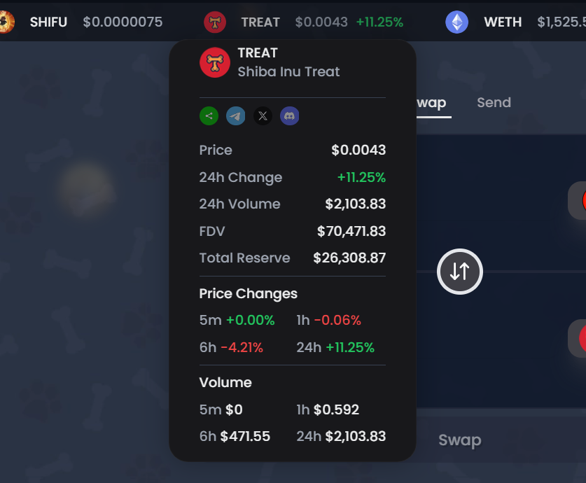 What’s neat about the ticker is that it’s **interactive**. If a user **clicks on a token** shown in the ticker, ChewySwap will open a **popup** with more detailed information. In that token detail popup, users can typically find: