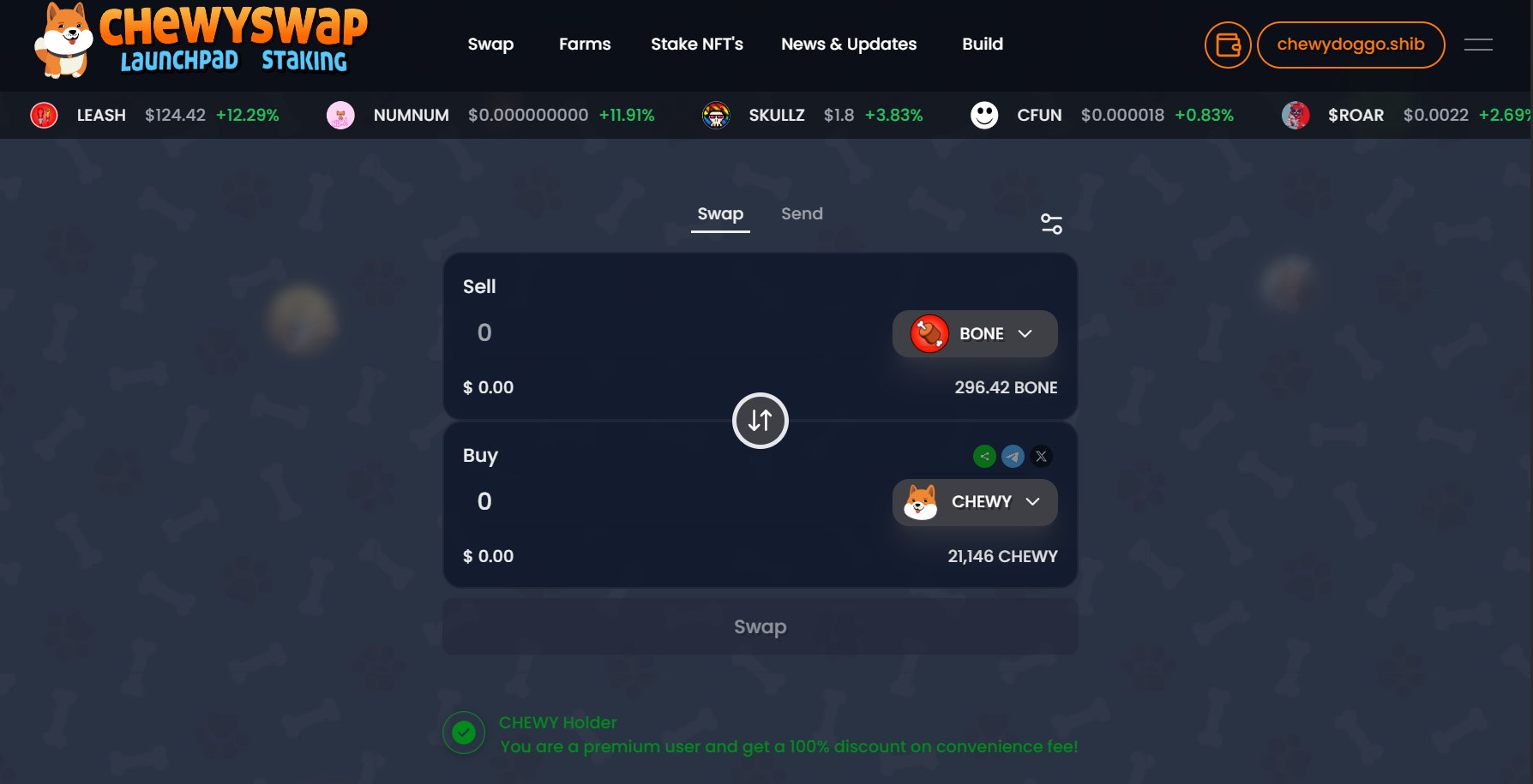 The ChewySwap DEX aggregator page isn’t just a swap tool – it also keeps users informed with a handy **market ticker** running along the interface. This ticker is essentially a scrolling (or updating) list of select token prices and their 24-hour change, giving a quick pulse of the market at a glance. It often displays popular tokens (like major Shibarium ecosystem coins and other trending assets) with their current price in USD (or the chain’s native token) and a small indicator of how much the price has moved in the last day (e.g., +5% or -3%). The presentation might use color cues – green for price up, red for price down – to make it easy to scan.